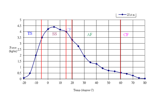 上图明显的标示出每个流变区内剥离力和破坏模式的变化。这张图证明了剥离强度在试验或使用温度高于室温时确实是随着温度上升而降低。